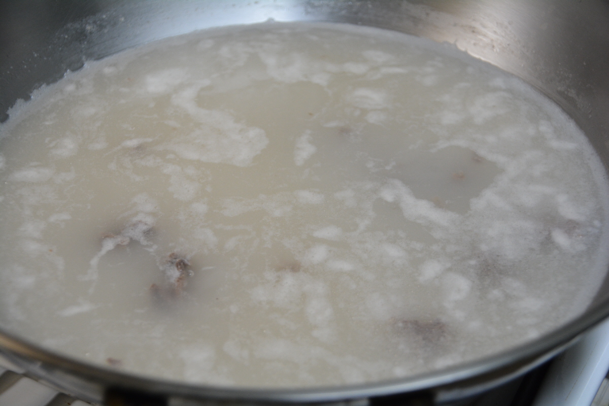 육수가 끓으면 소금을 넣어 삼삼하게 간을 해주시고,