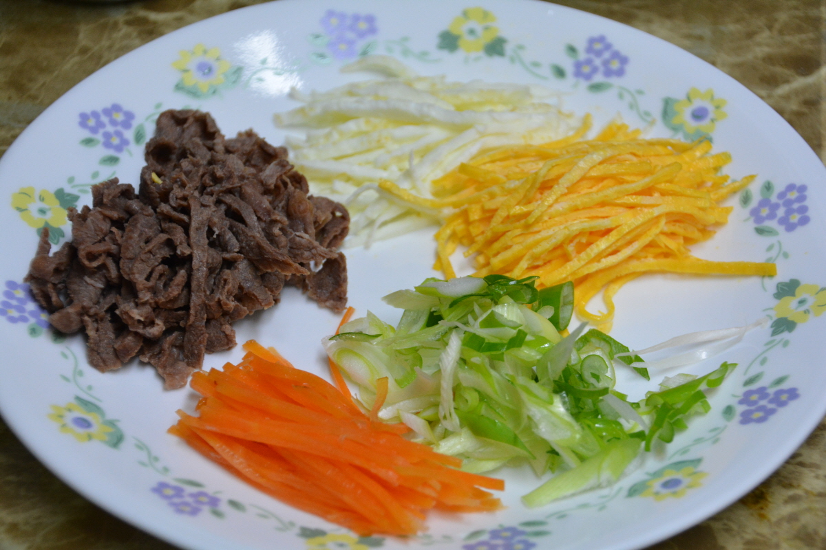 고명-당근채 약간, 달걀지단, 소고기 50~60그램, 김, 대파.